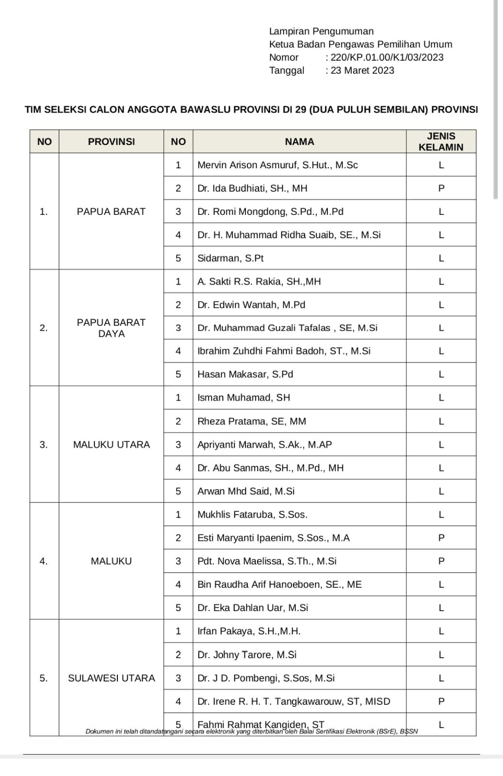 kspsi-aceh.or.id/ – Bawaslu RI akhirnya mengumumkan nama -nama anggota tim seleksi Bawaslu Provinsi se-Indonesia, Jumat (24/03/2023).