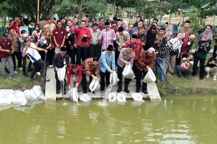 Selain penebaran benih ikan, giat penghijauan juga dilakukan dengan menanam bibit tanaman yang dilakukan secara simbolis. (***)